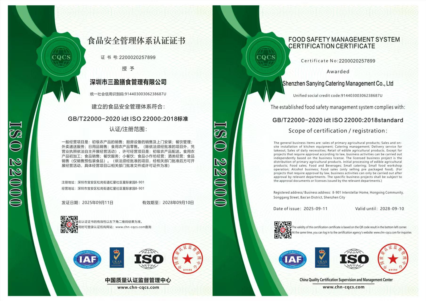 食品安全管理體系認(rèn)證證書