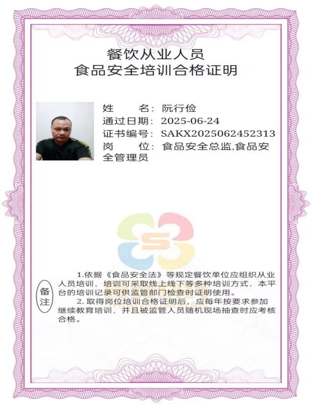 從業(yè)人員食品安全培訓(xùn)合格證明
